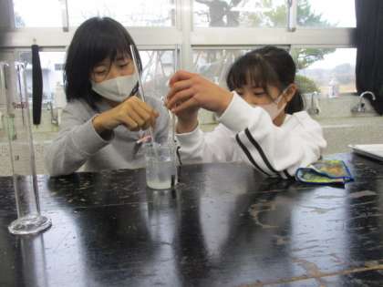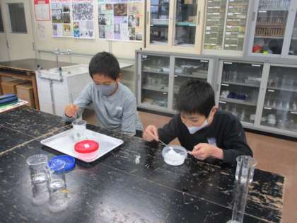 今日は、水の温度が異なると溶ける量が変わるのかについて実験しています。