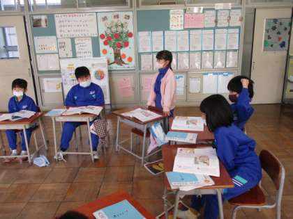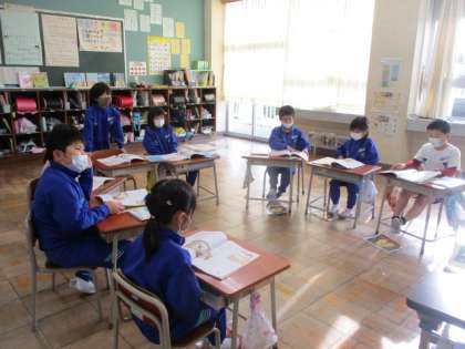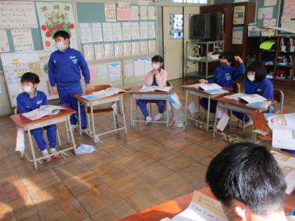 工夫してあきらめずに取り組んだ主人公の行動から自分が考えたことを話しあっています。
