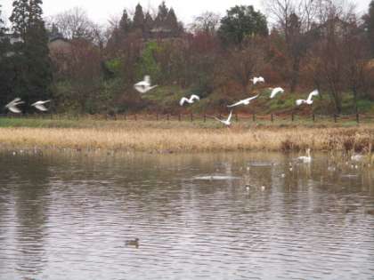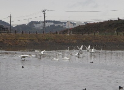 午前9時過ぎに、数羽の白鳥の飛び立ち、子供たちの歓声が上がりました。