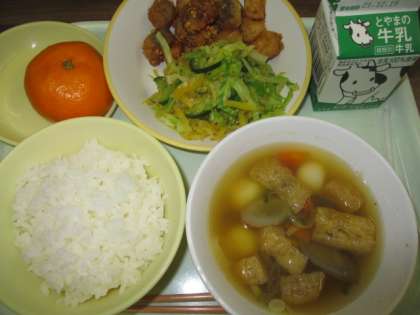 今日の献立は、ごはん、牛乳、魚と大豆の柚子ソースからめ、合わせ和え、冬至の団子汁、みかんです。