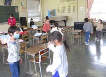 楽しい音楽の時間。ジェンカのリズムに合わせて踊ります。担任の先生もホップ、ステップ、ワン、ツー、スリーと参加しました。