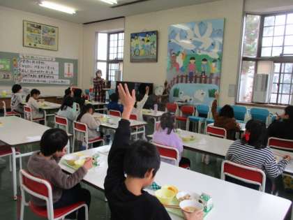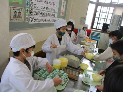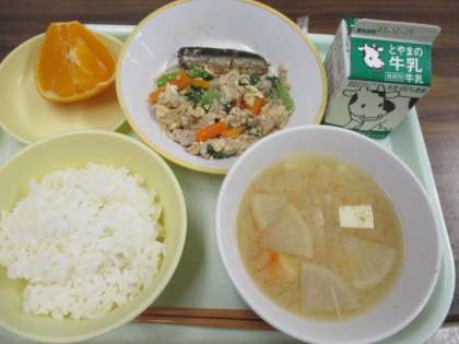 今日の献立は、ごはん、牛乳、イワシの梅煮、卵と青梗菜の炒め物、いものこ汁、アイカです。