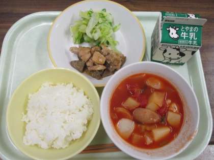 今日の献立は、ごはん、牛乳、冬野菜のミネストローネ、鶏肉とレバーのネギソース、ゆでキャベツです。