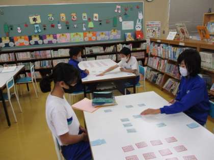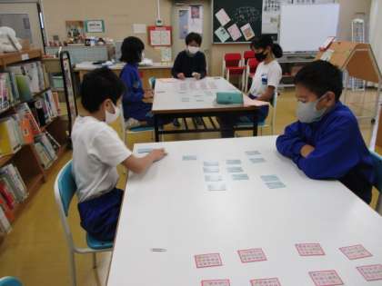 百人一首に挑戦。 上の句で、すぐに札をとれるように練習しています。