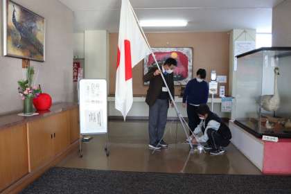 鏡餅の隣に飾ってある「サルノコシカケ」は三熊地区のK様が持ってきてくださいました。生け花は、合唱指導に来てくださっていたK先生からいただきました。ありがとうございます。