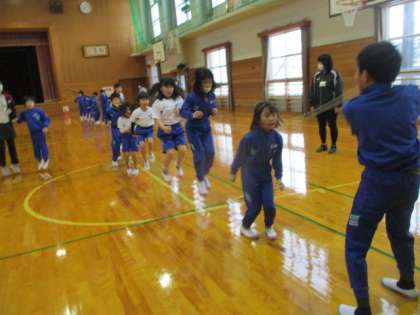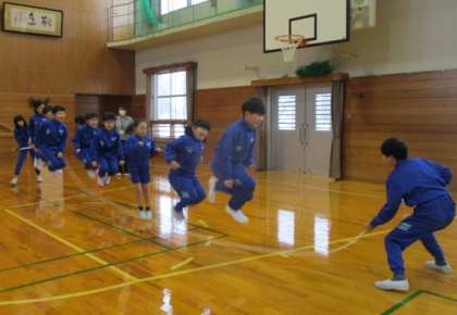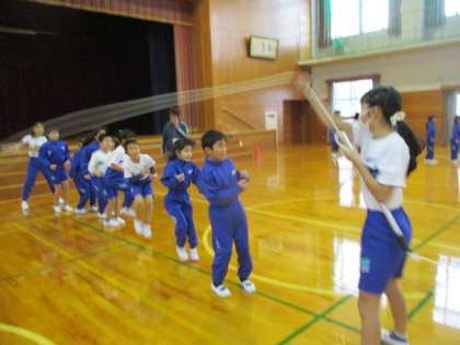 大繩を回す役目にはコツがいります。 高学年児童が大役を担っています。