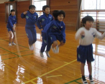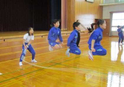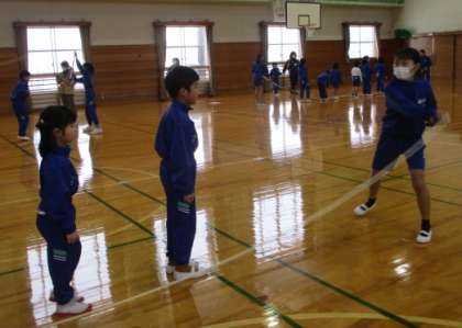 大繩を回す子供たちが中心になってジャンプがそろうように練習しています。