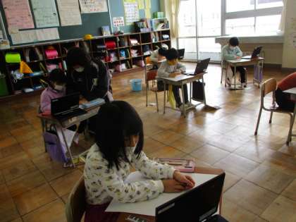 ○○している自分の顔をスケッチしています。クロームブックで自分の顔を撮影し、部分を拡大したり、全体を見たりしながら下絵づくりをしました。