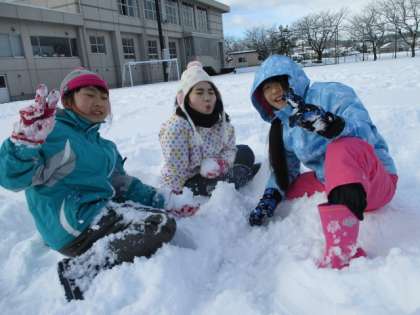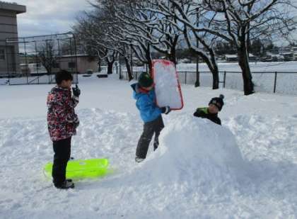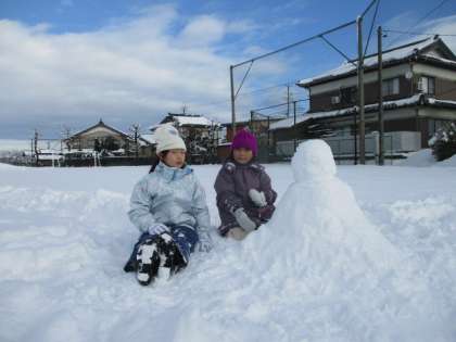 新雪が美しく降り積もり、さっそく雪で造形の子供たちです。