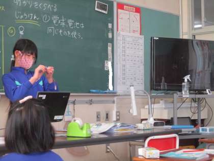 豆電球を光らせるときの導線のつなぎ方について話し合っています。