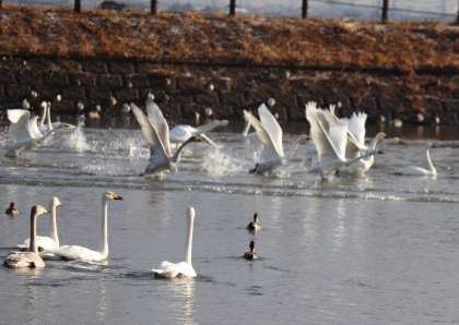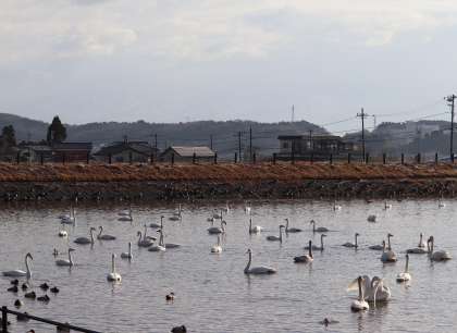 8時過ぎの田尻池には、たくさんの白鳥が休んでおり、次々に飛び立つ姿が見られました。