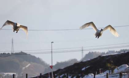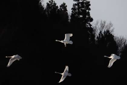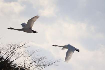池の水面をけるときは、羽の音をバサバサ立てて力強く進みますが、上空に上るにつれ、羽の動きの音は聞こえなくなります。