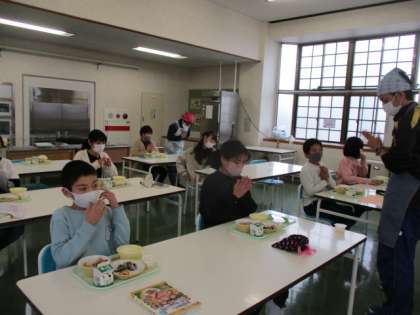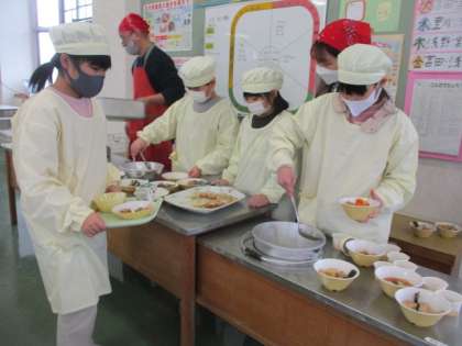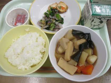 今日の献立は、ごはん、牛乳、おでん、野菜の肉巻き、ゆかり和え、納豆 です。