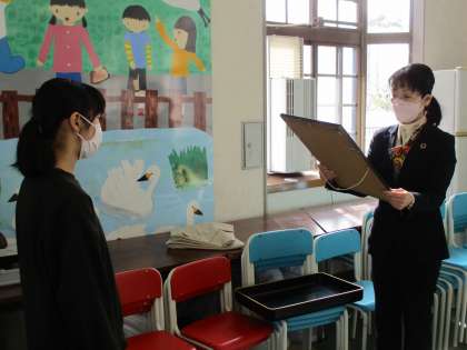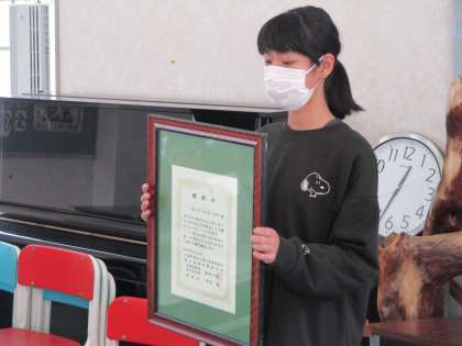 親切善行の集いで表彰予定でしたが、感染予防のため参集しての表彰式がなくなりました。校内で顕彰状を児童代表に授与しました。