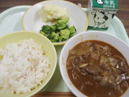 今日の献立は、麦ごはん、ビーフストロガノフ、チーズポテト、グリーンサラダ、牛乳です。