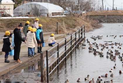 今朝の田尻池には94羽の白鳥が観測されましたが、子供たちが活動をする時刻にはカモだけが田尻池にいました。