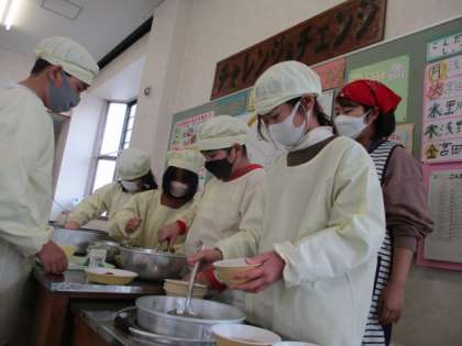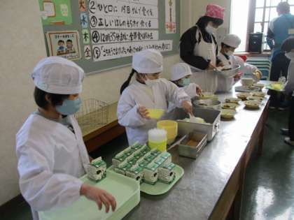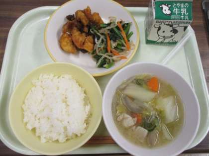 今日の献立は、ごはん、牛乳、鶏肉とレバーのカレー風味、小松菜のナムル、タラ汁です。