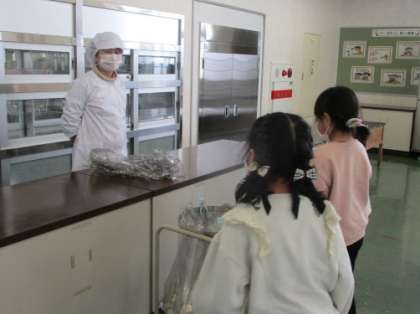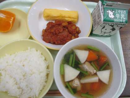 今日の献立は、ごはん、牛乳、卵ロール、白いんげん豆のトマト味、野菜のスープ煮、かんぺいです。