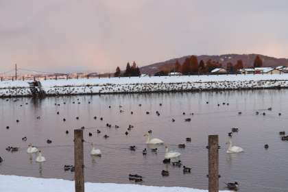 5時半ごろの田尻池です。ほんのり水面が夕日でピンク色に染まっています。