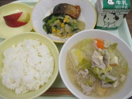 今日の献立は、ごはん、牛乳、さばの照り焼き、青梗菜ソテー、豚汁、リンゴです。