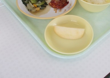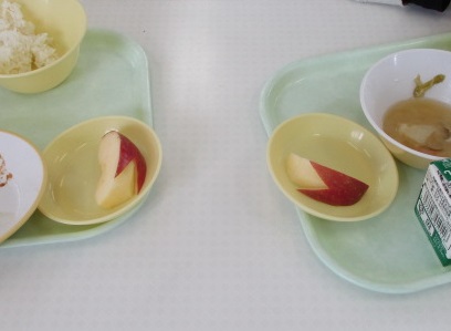 リンゴは、ウサギ型に飾り切りしてあるものと皮を全部むいたものがあります。子供たちは自分でどちらかを選んで食べています。