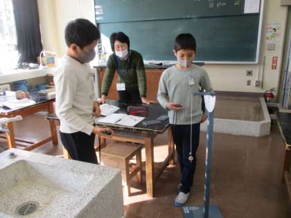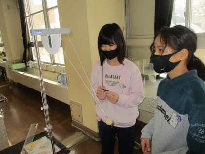 振り子の振れ幅は何によって変わるのかについ調べています。予想を立てて重さや長さを変えて実験しています。