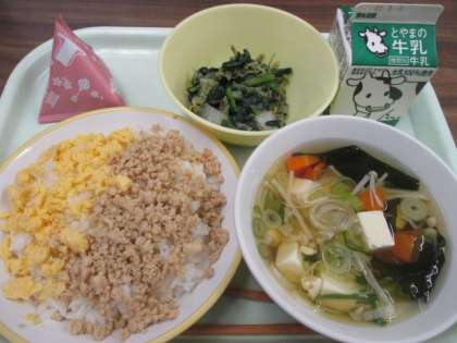 そぼろ丼、澄まし汁、よごし、牛乳、ひなあられをおいしくいただきました。