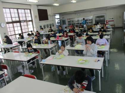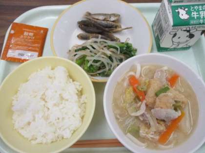 今日の献立は、ごはん、牛乳、白ごま豆乳うどん、コアジの唐揚げ、菜花びたし、こくもつふりかけです。