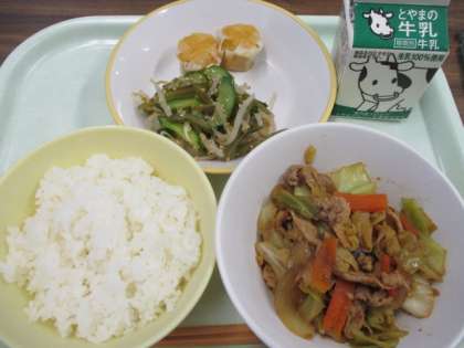 今日の献立は、ごはん、牛乳、ホイコーロー、ニンジンシューマイ、茎わかめのごまずあえです。