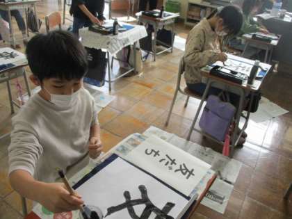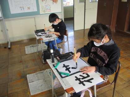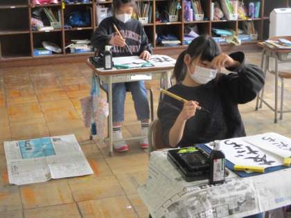 卒業を祝う言葉を選び、毛筆で取り組みました。
