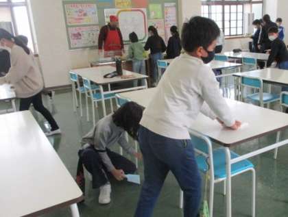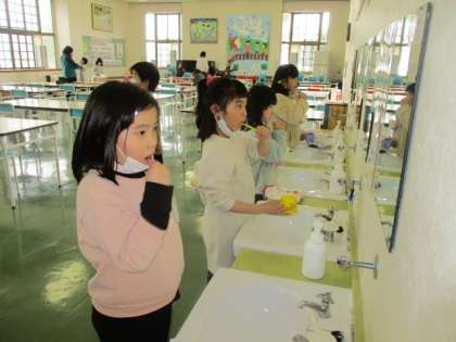 おいしい給食後は、自分の使ったテーブルふきと床掃除、そして歯磨きです。短時間でてきぱきと行います。