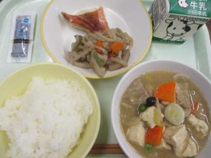 今日の献立は、ごはん、牛乳、赤魚の塩焼き、レンコンきんぴら、豆腐と野菜のうま煮、のり佃煮です。