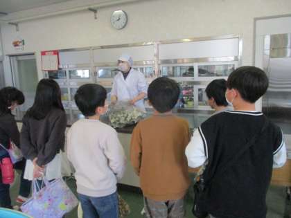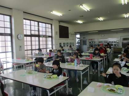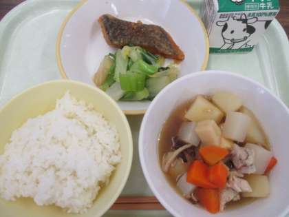今日の献立は。ごはん、牛乳、揚げ魚のレモン味、大和煮、白菜浸しです。