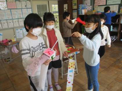 空気を入れるとふくらむポリ袋の性質を生かして作品作りをしました。