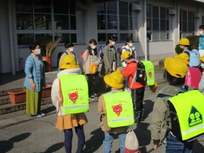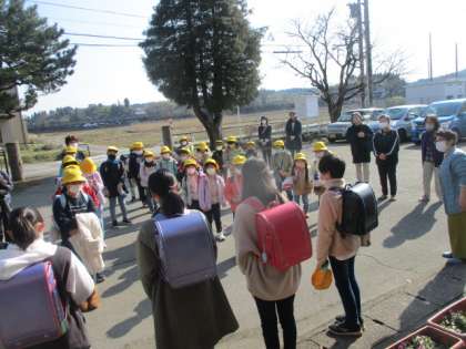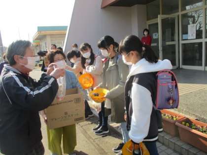 はくちょう子供会で、例年行っていた「卒業生を祝う会」は感染予防のため、玄関での会となりました。
