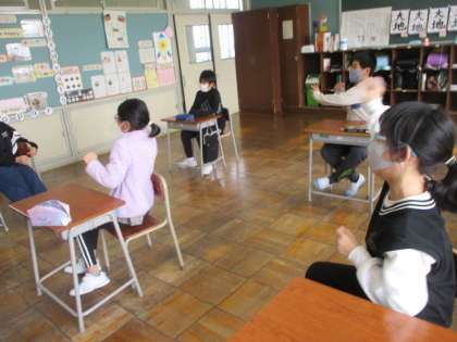 「だるまさんが笑った」「寝た」「楽器を演奏した」などの言葉に合わせてその動作をします。仲良しな4年生。ほほえましい一コマです。