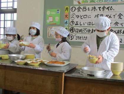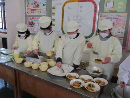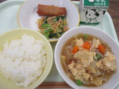 今日の献立は、ごはん、牛乳、親子煮、納豆和え、春巻きです。