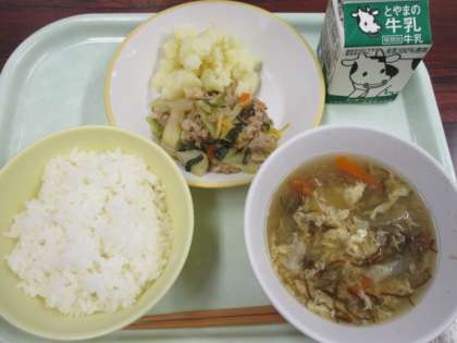 今日の献立は、ごはん、牛乳、豚肉のキムチ炒め、こふき芋、卵とモズクのスープです。