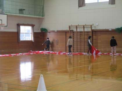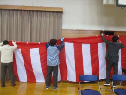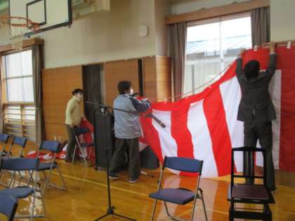 3月14日の放課後、職員で卒業式の紅白幕を張りました。