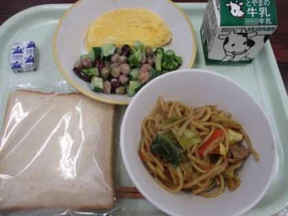 今日の献立は、食パン、牛乳、焼きそば、オムレツ、ビーンズサラダ、ポケットチーズです。