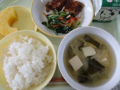 今日の献立は、ごはん、牛乳、魚のかば焼き、はりはり和え、みそ汁、カットパインです。