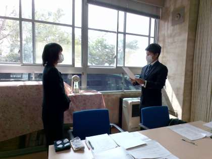 新規採用教員の先生が、全教職員の前で公務員としての「宣誓書」を読み上げました。