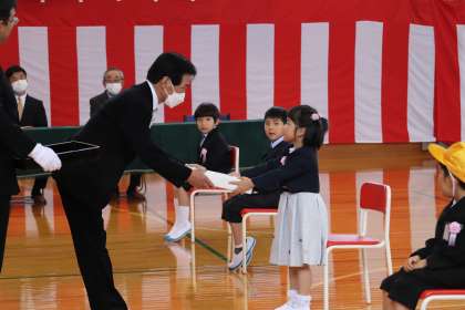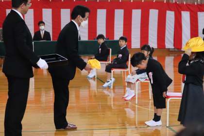交通安全協会からは交通安全帽、防犯協会から防犯ブザーが贈呈されました。1年生は、とてもうれしそうでした。