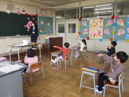 1年生教室では、担任の先生や友達と楽しく言葉を交わしています。池多小学校の生活に早く慣れるとよいですね。