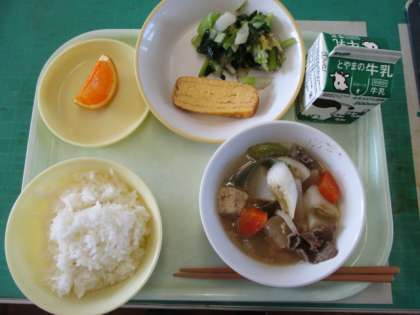 4月12日(火)今日の給食 公開日 2022/04/12 更新日 2022/04/12 池多っ子ゴーゴー 今日のメニューは、ご飯、牛肉と大根のごますき煮、厚焼きたまご、おひたし、きよみオレンジ、牛乳でした。色鮮やかです。