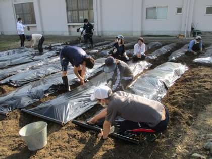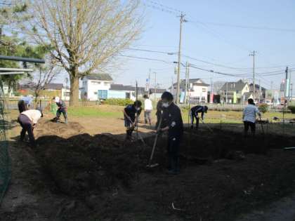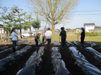 放課後、職員で力を合わせて畝をつくりました。子供たちと一緒に苗を植えるのが楽しみです。