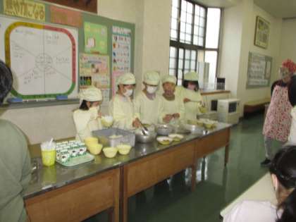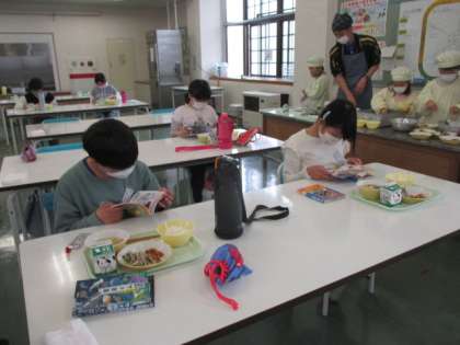 当番の子供たちは、上手におかずをよそっています。食べるまでの間、本を読んで静かに待っています。