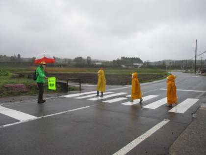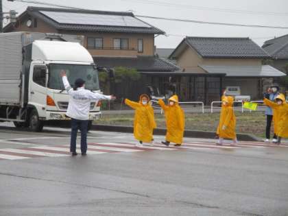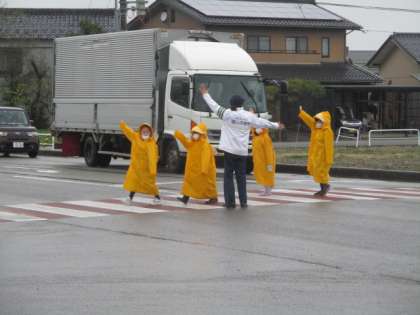 尊い命を大切にするため、警察の方、地域の方をお招きして交通安全教室を行いました。お話を聞き、実際の歩く様子からご指導していただきました。外は細かい雨が降る中でしたが、1、2年生は交通ルールをしっかり守ろうと、気を付けて歩くことができました。警察の方には、みんなが一列で上手に歩いていることを褒めていただきました。
