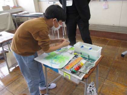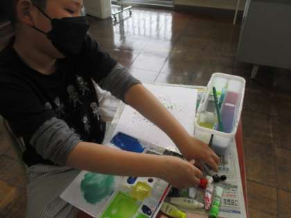 絵の具を使って「ゆめもよう」を描いています。一人一人が思い思いにイメージし、楽しんで活動しています。作品の仕上がりが楽しみです。