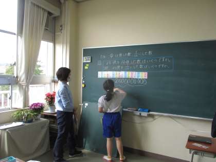 課題についてよく考え、答えを自分でしっかりと黒板に書き表しました。位が大きくなると「0」の数は多くなりますが、何の位かを確かめることで、解くことができました。すらすら解くことができると、とても楽しくなりますね。